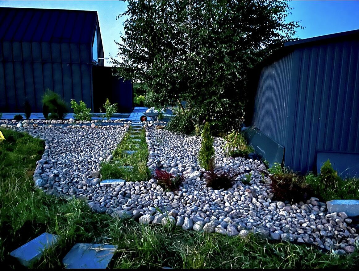 -zaaranzowany ogrod z ponad 100 tonami kamieni nawiezionych by zapewnialy bezpieczenstwo wodne roslin, ochrone przed przemarzaniem i byly po prostu ladne.