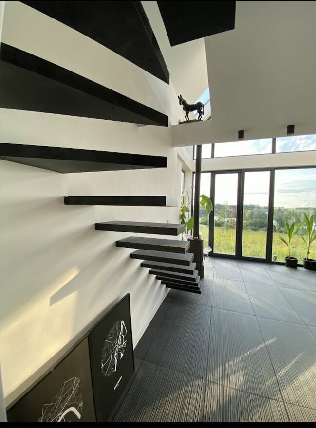 - wykonczenie materialami Italgraniti, stal proszkowana schody kasetowe, drzwi przesuwne w lacobel, szafy w systemie Elfa, kuchnia mala ale zgrabna w polysku i bieli.